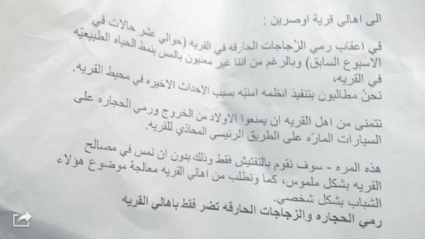 ومما جاء في المنشورات التي تم توزيعها على الأهالي: "في أعقاب رمي الزجاجات الحارقة في القرية (حوالي عشر حالات الأسبوع السابق) وبالرغم من أننا غير معنيين بالمس بنمط الحياة الطبيعية في القرية، نحن مطالبون بتنفيذ أنظمة أمنية بسبب الأحداث الأخيرة في محيط القرية. نتمنى من أهل القرية أن يمنعوا الأولاد من الخروج ورمي الحجارة على السيارات المارة على الطريق الرئيسي المحاذي للقرية. هذه المرة سنقوم بالتفتيش فقط دون أن نمس في مصالح القرية بشكل ملموس، كما نطالب من أهالي القرية بمعالجة موضوع هؤلاء الشباب بشكل شخصي. رمي الحجارة والزجاجات الحارقة تضر فقط بأهالي القرية".