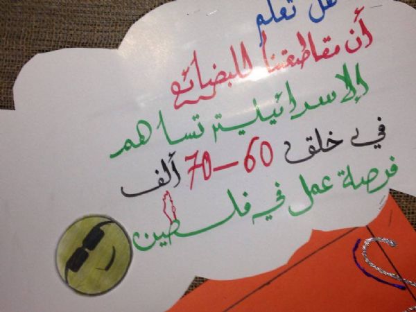 وأضاف أحد العاملين بجمعية تنمية الشباب سمير درويش " ان الجمعية قامت بتعزيز الفكرة من خلال وضع مقابل كل منتج إسرائيلي منتج فلسطيني، بالاضافة الى كتابة لوحات تحث على المقاطعة الإسرائيلية.