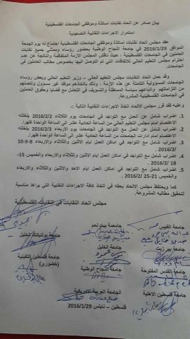 نابلس- أصداء- قرر مجلس اتحاد نقابات الجامعات الفلسطينية اتخاذ مجموعة من الإجراءات النقابية خلال شهر شباط المقبل.