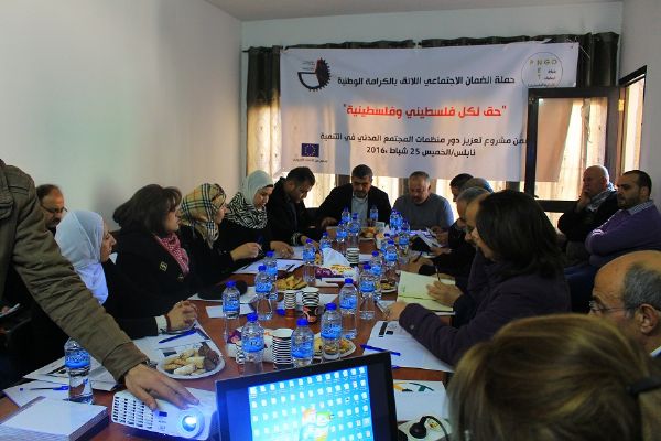 نظمت شبكة المنظمات الأهلية الفلسطينية ورشة عمل تنسيقية للمؤسسات الأعضاء، في مقر الإغاثة الزراعية في مدينة نابلس، وهدفت إلى تنسيق الجهود بين المؤسسات الاعضاء وتبادل الخبرات، بالاضافة الى قراءة نصوص قانون الضمان الاجتماعي وعرض فعاليات الحملة الوطنية من اجل الكرامة والعدالة الاجتماعية.