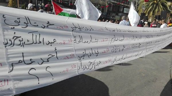 وارتدى المشاركون الكوفية الفلسطينية ورفعوا علما فلسطينيا كبيرا على دوار الشهداء، كما رفعوا يافظة تحمل أسماء الشهداء.