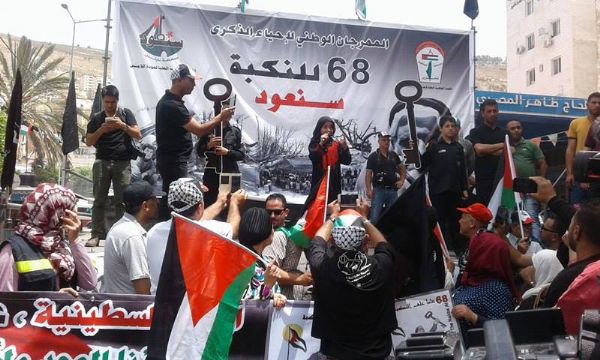 أصداء- مي الزبن- نظمت الهيئة العليا لإحياء ذكرى النكبة، اليوم الأحد، مهرجانا جماهيريا لإحياء الذكرى 68 للنكبة على دوار الشهداء وسط مدينة نابلس.