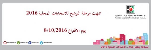 أعلنت لجنة الانتخابات المركزية انتهاء مرحلة الترشح للانتخابات المحلية 2016 والتي بدأت صباح يوم 16 آب، حيث واصلت مكاتب اللجنة في محافظات الضفة والقطاع استقبال طلبات الترشح حتى منتصف ليل الخميس.