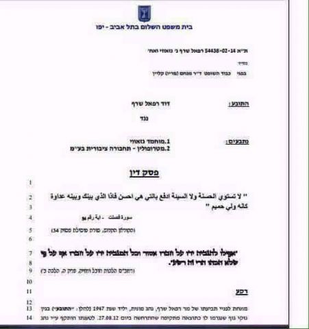 أصداء- القاضي مناحم كلاين من محكمة الصلح في تل ابيب يقوم في قراره بالاعتماد على آية قرآنية: ولا تستوي الحسنة ولا السيئة ادفع بالتي هي أحسن فإذا الذي بينك وبينه عداوة كأنه ولي حميم.
