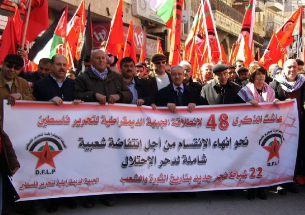 نابلس - نظمت الجبهة الديمقراطية لتحرير فلسطين في محافظة نابلس مسيرة جماهيرية حاشدة، لمناسبة الذكرى السنوية الثامنة والأربعين لانطلاقتها، وذلك تحت شعار "نحو إنهاء الانقسام، من اجل انتفاضة جماهيرية شاملة لدحر الاحتلال"، بمشاركة عضوي المكتب السياسي للجبهة تيسير خالد وماجدة المصري، وممثلي الأطر والفصائل والمؤسسات الرسمية والشعبية، والمئات من قادة وعناصر الجبهة الديمقراطية.