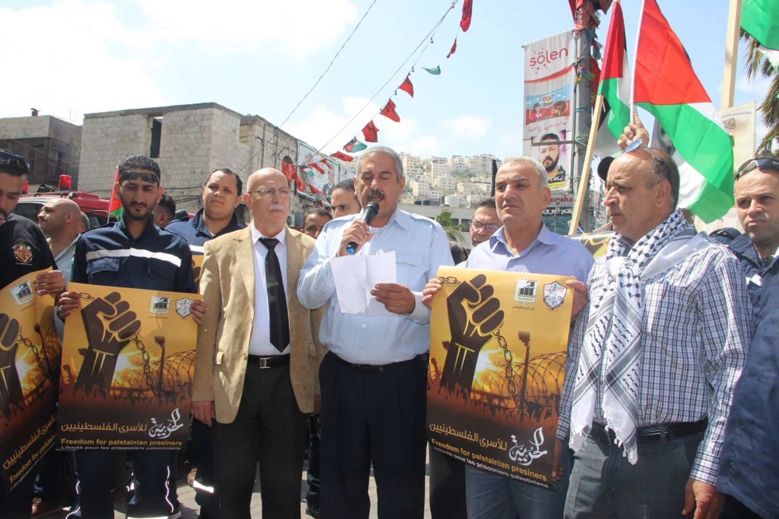 نظمت اليوم الاربعاء مسيرات وفعاليات تضامنية مع الاسرى المضربين عن الطعام وسط نابلس، نظمت إحداها نقابة العاملين في قطاع النقل والمواصلات، والثانية العاملين في اطفائية بلدية نابلس. وانطلقت مسيرة السيارات من أمام مجمع القرى الغربية، ومن ثم عبر شارع سفيان بإتجاه دوار الشهداء وسط المدينة، حيث خيمة الاعتصام مع الاسرى المضربين, كما انطلقت مسيرة اخرى من أمام مبنى اطفائية نابلس عبر شارع فيصل، ومن ثم إلى الدوار، وهناك تجمع عمال وموظفي الاطفائية امام الخيمة.
