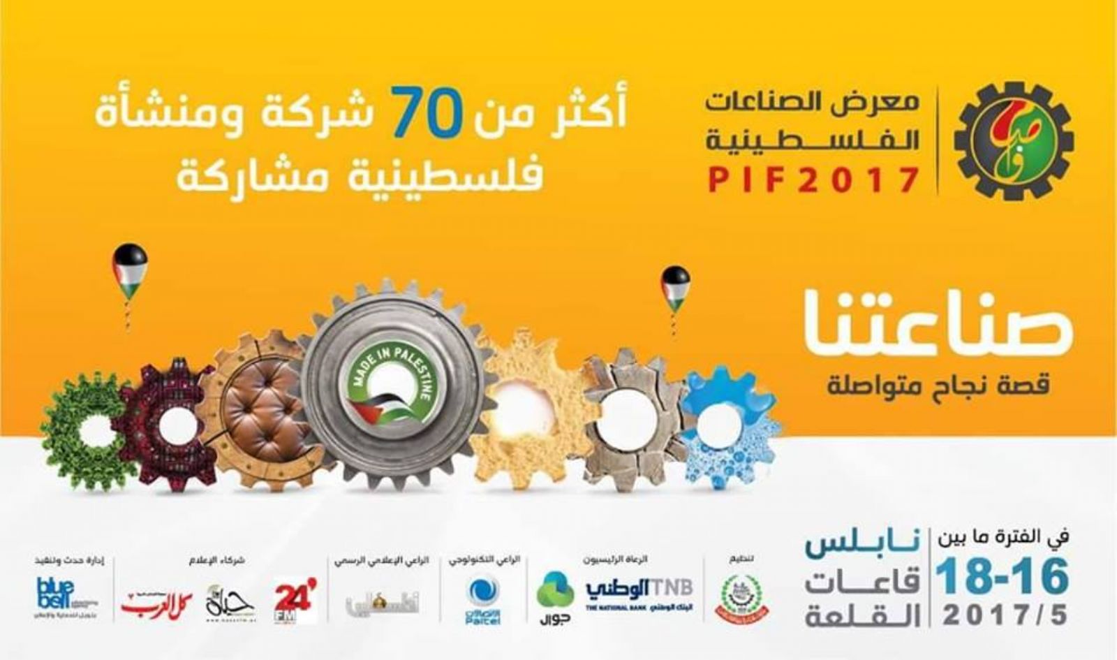 تستعد نابلس لإطلاق فعاليات معرض الصناعات الفلسطينية 2017م في السادس عشر من أيار الحالي ، والذي سوف يتواصل على مدار ثلاثة أيام وحتى الثامن عشر من الشهر ذاته على ارض قاعات القلعة بالمدينة ، بتنظيم من غرفة تجارة وصناعة نابلس ، وتحت رعاية دولة رئيس الوزراء الدكتور رامي الحمد الله ، وبرعاية رئيسية شركة الاتصالات الخلوية الفلسطينية (جوال) والبنك الوطني، والراعي التكنولوجي شركة الاتصالات الفلسطينية (بالتل)، وراعي الاعلام الرسمي الهيئة العامة للاذاعة والتلفزيون الفلسطيني ، وبشراكة اعلامية مع راديو 24 اف ام ، وراديو حياة ، وموقع كل العرب ، وتنفيذ وادارة حدث من شركة (بلوبل) للدعاية والاعلان. وتعتبر نابلس عاصمة فلسطين الاقتصادية كما اطلق عليها الشهيد الراحل (ابو عمار) مما يعطيها ثقلاً اقتصادياً مهماً على الصعيد الاقتصادي الوطني الفلسطيني.
