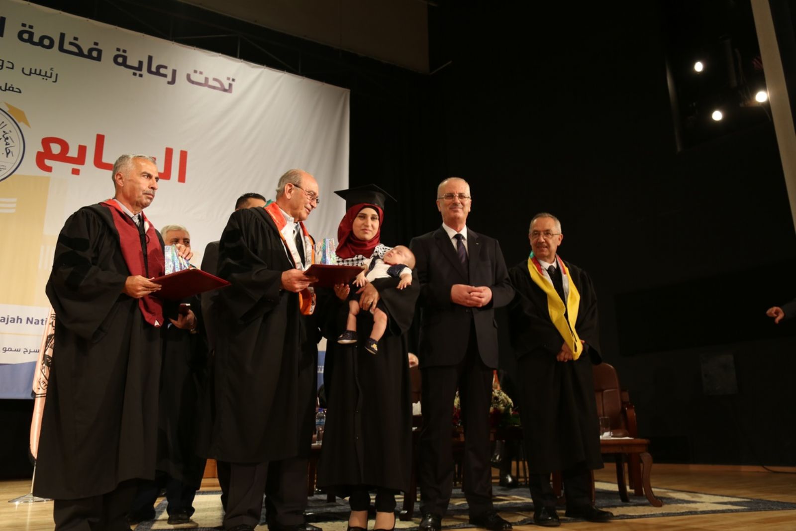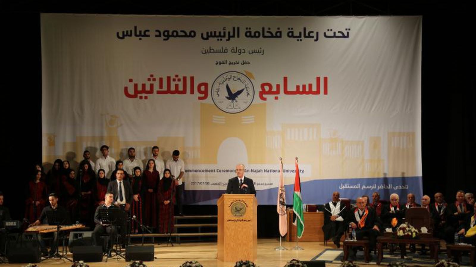 تحت رعاية الرئيس محمود عباس وبحضور دولة رئيس الوزراء الأستاذ الكتور رامي حمد الله، ممثلاً عن سيادته، وبحضور السيد صبيح المصري، رئيس مجلس أمناء الجامعة، وأعضاء مجلس الأمناء، والأستاذ الدكتور ماهر النتشة القائم بأعمال رئيس الجامعة، ونواب رئيس الجامعة ومساعديه وجميع عمداء كليات الجامعة ورؤساء الأقسام والهيئات الإدارية في الجامعة وبحضور رسمي وشعبي واسع، أطلقت جامعة النجاح الوطنية يوم الخميس الموافق6/7/2017، باكورة الإحتفالات بتخريج الفوج السابع والثلاثين من طلبتها، بحفل تكريم أوائل الكليات والأقسام وطلبة كلية الشرف أُقيم في مسرح سمو الأمير تركي بن عبد العزيز في الحرم الجامعي الجديد.