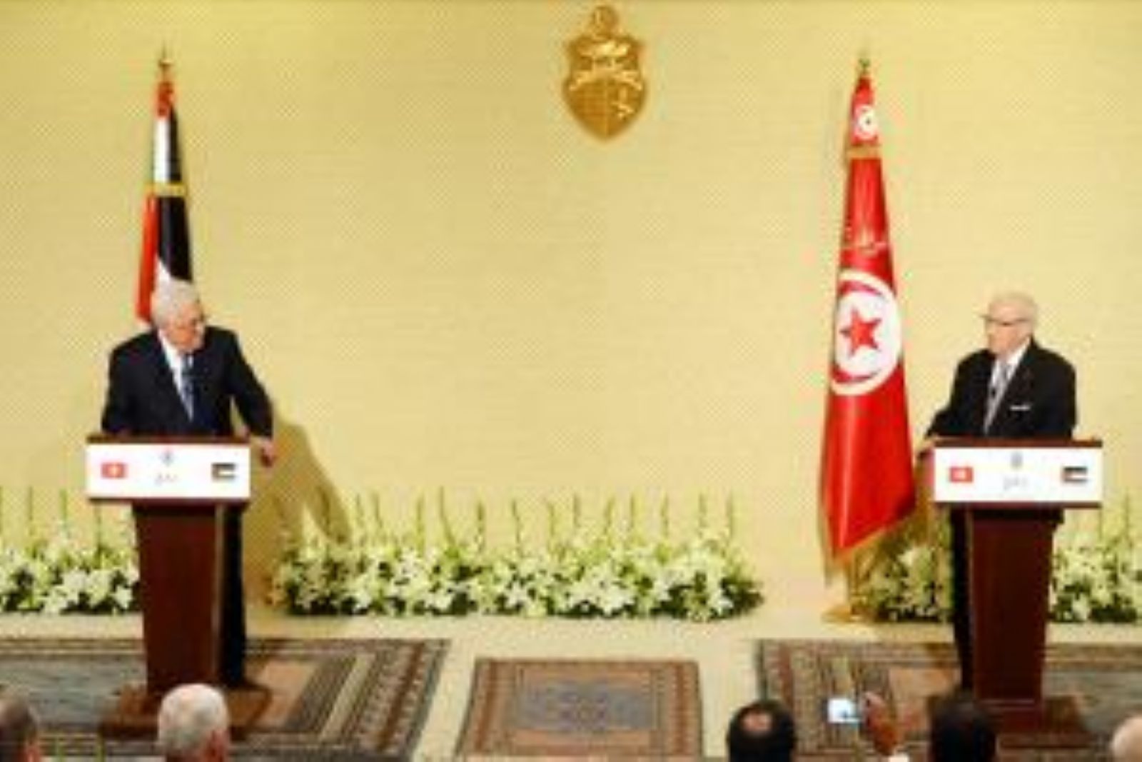 من جهته، قال الرئيس التونسي الباجي قائد السبسي إن المرء لا يرحب به في عقر داره، والعلاقات بين فلسطين وتونس جذورها ممتدة في التاريخ، ونحن شعب واحد وقيادة واحدة، ومن حسن حظ الجميع أن القيادة الفلسطينية لما خرجت من تونس ذهبت إلى فلسطين، تماما كما حصل عندما احتضنت تونس الثورة الجزائرية التي خرجت إل دولة جزائرية في أرض الجزائر.