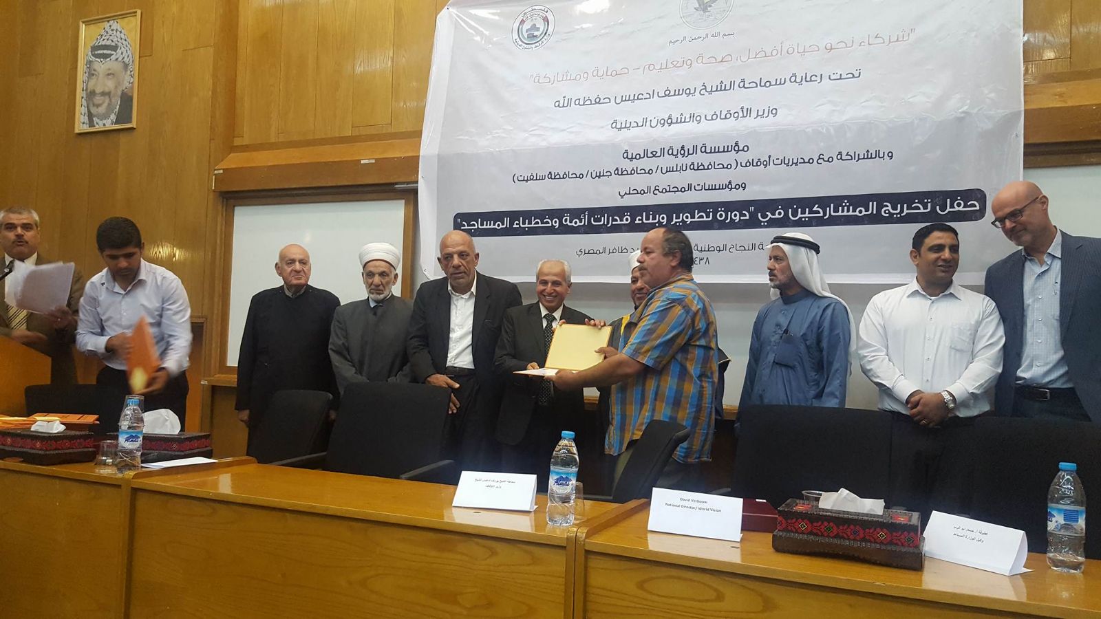 نظمت مؤسسة الرؤية العالمية وتحت رعاية الشيخ يوسف ادعيس وزير الاوقاف والشؤون الدينية وبمشاركة مديريات الاوقاف في محافظات نابلس وجنين وسلفيت ومؤسسات المجتمع المدني حفلا لتخريج المشاركين في دورة تطوير وبناء قدرات أئمة وخطباء المساجد وذلك في مدرجات الشهيد ظافر المصري في جامعة النجاح الوطنية بنابلس.