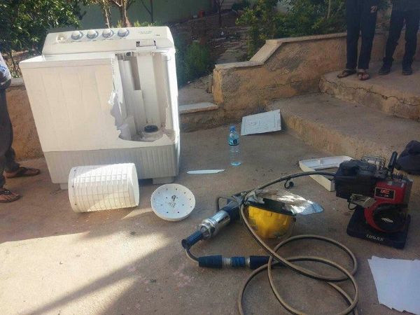 صور.. الدفاع المدني ينقذ طفلة علقت في نشافة ملابس