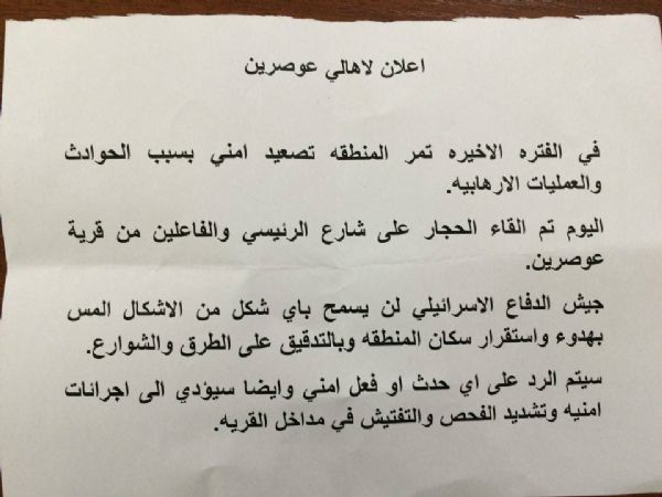 الاحتلال يهدد أهالي قرية اوصرين بتشديد الإجراءات الأمنية