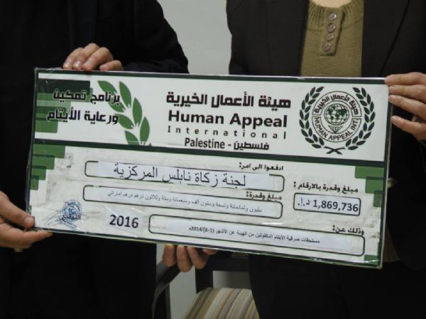 نابلس:اصداء- سلمت هيئة الأعمال الخيرية الإماراتية ممثلة بالمفوض العام للهيئة في الضفة الغربية إبراهيم الراشد لجنة زكاة نابلس ممثلة برئيسها الحاج سامح طبيلة شيكا بقيمة 1.869.736 مليون درهم إماراتي كفالة لحوالي 1600 من الأيتام المكفولين لدى لجنة زكاة نابلس.