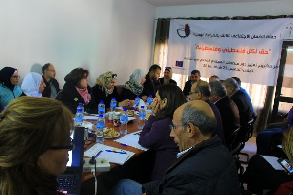 نظمت شبكة المنظمات الأهلية الفلسطينية ورشة عمل تنسيقية للمؤسسات الأعضاء، في مقر الإغاثة الزراعية في مدينة نابلس، وهدفت إلى تنسيق الجهود بين المؤسسات الاعضاء وتبادل الخبرات، بالاضافة الى قراءة نصوص قانون الضمان الاجتماعي وعرض فعاليات الحملة الوطنية من اجل الكرامة والعدالة الاجتماعية.