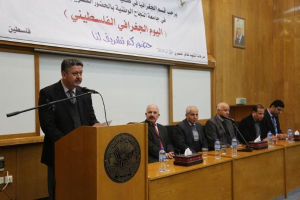تحت رعاية أ.د ماهر النتشة، القائم باعمال رئيس الجامعة، عقد قسم الجغرافيا في كلية الاقتصاد والعلوم الاجتماعية بجامعة النجاح الوطنية اليوم الاربعاء الموافق 30/3/2016 (اليوم الجغرافي الفلسطيني الاول)، بحضور د. محمد العملة، نائب الرئيس للشؤون الاكاديمية، وا. د. طارق الحاج، عميد كلية الاقتصاد والعلوم الاجتماعية، ود. احمد رأفت رئيس قسم الجغرافيا، ود. حسين الريماوي، رئيس الجمعية الجغرافية الفلسطينية، وعدد من أعضاء الهيئتين الادارية والتدريسية، وطلبة الجامعة.