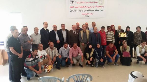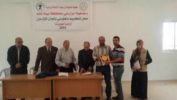 بين لحم:أصداء- كرمت جمعية التنمية الزراعية (الإغاثة الزراعية) /بيت لحم وجمعية مزارعي محافظة بيت لحم عدد من المزارعين والمتطوعين من قرى محافظة بيت لحم بالإضافة إلى تكريم عدد من المؤسسات المساندة لها وعلى رأسها جامعة بيت لحم ووكالة معا الإخبارية ووزارة زراعة بيت لحم وعدد من الجمعيات القاعدية وأيضا أعضاء من لجان الشعبية، حيث تم تنفيذ النشاط في قاعة بلدية بتير. وقام السيد عليان الشامي عضو بلدية بتير بالترحيب بالحضور، وبعد ذلك قال دكتور ميشيل صنصور نائب رئيس جامعة بيت لحم عن دور الإغاثة الزراعية في دعم المزارعين وأشاد بالتعاون والعلاقة ما بين الجامعة ومكتب الإغاثة زراعية في بيت لحم، ومن ثم تحدث المهندس الزراعي مجدي عمر مدير مديرة زراعة محافظة بيت لحم عن تعاون المشترك ما بين الوزارة والإغاثة الزراعية حيث ذكر بأنها شريك أساسي ورئيسي في العمل الزراعي معهم في محافظة بيت لحم، ثم تحدث دكتور عبد الغني حمدان منسقة مكتب الخليل كممثل عن جمعية تنمية الزراعية (الاغاثة الزراعية) عن تعزيز الشراكة ما بين المؤسسات العاملة في القطاع الزراعي.