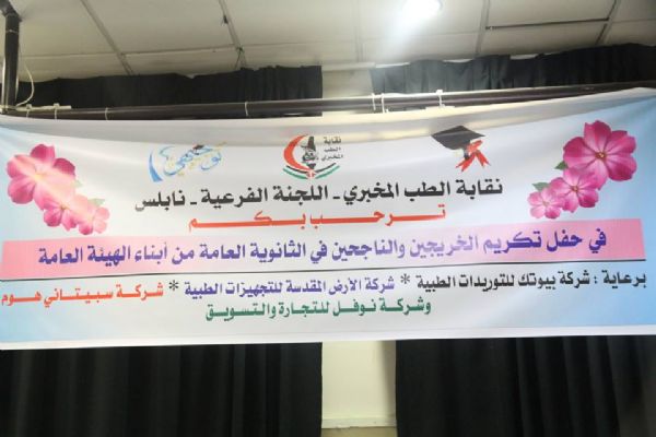 نابلس :- نظمت نقابة الطب المخبري – اللجنة الفرعيه – نابلس حفلا تكريميا لأعضائها وأبنائهم وذلك بمناسبة نجاحهم في امتحان شهادة الدراسة الثانوبه العامة –التوجيهي – وكذلك تخرج عدد منهم من الجامعات وذلك اليوم الاربعاء الموافق 3/8/2016 في قاعة مركز حمدي منكو التابع لبلديه نابلس وتحت رعاية شركة بيوتك للتجهيزات الطبية وشركة الارض المقدسة للتوريدات الطبية وشركة سبيتاني هوم وشركة نوفل للتجارة والتسويق. وحضر الاحتفال رئيس وأعضاء اللجنة الفرعيه للنقابة بنابلس وجمع غفير من اعضاء النقابة وعائلاتهم وأبنائهم الناجحين.