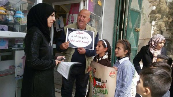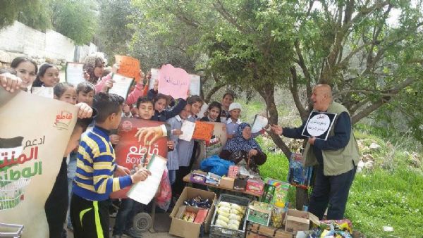 وتحلق التلاميذ حول خالد منصور - منسق الحملة الشعبية لمقاطعة البضائع الإسرائيلية، حاملين لافتات المقاطعة وأعلام الوطن ويتوقفون عند كل دكان ويوقفون كل مواطن يجدوه بالشارع كل سيارة تمر بهم ويتنافسون من الذي سينقل رسالة المقاطعة ويبلغ الأهالي بضرورة مقاطعة البضائع الإسرائيلية والانحياز للبضائع الوطنية .. وبلغتهم البسيطة كانوا يحاورون الناس قائلين : إحنا فلسطينية وعيب وعار علينا نشتري بضائع إسرائيلية بضائع اللي بقتلو أطفالنا ونساءنا وشيوخنا .. دخلوا محلات البقالة والمكتبات والصيدليات والمطاعم وتحدثوا مع ربات البيوت على مداخل منازلهن .. وهتفوا مع خالد منصور بصوت عال وجميل ( فلسطين بنحبك .. بدنا نقاطع عدوك – بدنا نقاطع يفلسطين .. منتوجات المحتلين -- عيب وعار علينا .. نفيد الغاصب بيدينا – يلي بدك لاستقلال .. قاوم قاطع لاحتلال ).
