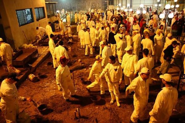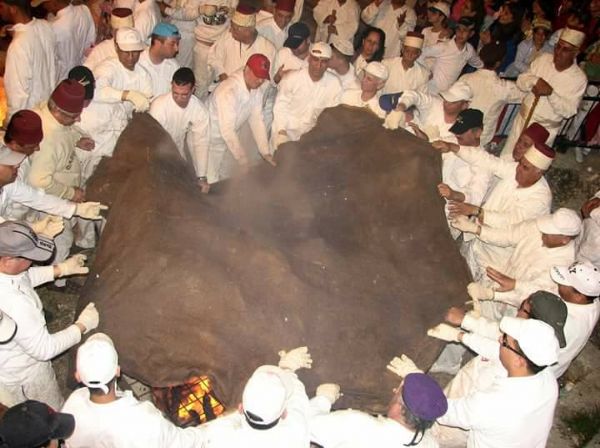 وفي غمرة هذه الفرحة الكبرى ترى الكل مهنئا الآخر معانقا ومخاطبا كل عام وانتم بخير، يتم اثناء ذلك سلخ الخراف ومن ثم تعلق الخراف لإخراج زوائدها الداخلية لحرقها، ثم تنظف بالماء ويوضع كل خروف بصادود من الخشب لكي يسهل تنزيله واخراجه من التنانير العميقة، ومن ثم تشرح الخراف وتملح بحسب اوامر الشريعة المقدسة. ها وتمليحها حتى يتم اعدادها لتنزيلها الى داخل التنانير حتى تشاهد ابناء الطائفة منشغلين بتحضير الجبلة من الطين، وما ان ينتهي ابناء الطائفة من تحضير الخراف وتصميطها وتنظيفها وتشريح لشبكة الحديدية وغيرهم يحمل العشب الاخضر ليقوموا بتغطية الشبكة حتى لا يتسخ لحم الخراف من جراء تغطيته بالتراب، وما ان يضعوا شباب الطائفة الممسكون بالخراف في التنانير وسط اهزوجة واناشيد فرحة وكبرياء متحدين للسعة النار الصاعدة من جوف التنانير، هذه النار التي تستمر مستعرة مدة ست ساعات متتالية، وكأن المنظر كيوم الحشر، ضمن صورته المبهجة المفرحة وتستمر الخراف داخل التنانير مدة ثلاث ساعات متتالية وعند منتصف الليل يجتمع جميع ابناء الطائفة ثانية بعد ان قضى اكثرهم وقته في اداء صلاة مساء العيد التي كادت ان تنتسى لولا الأولون الذين سطروها وكتبوها في مجاميع صلواتهم.