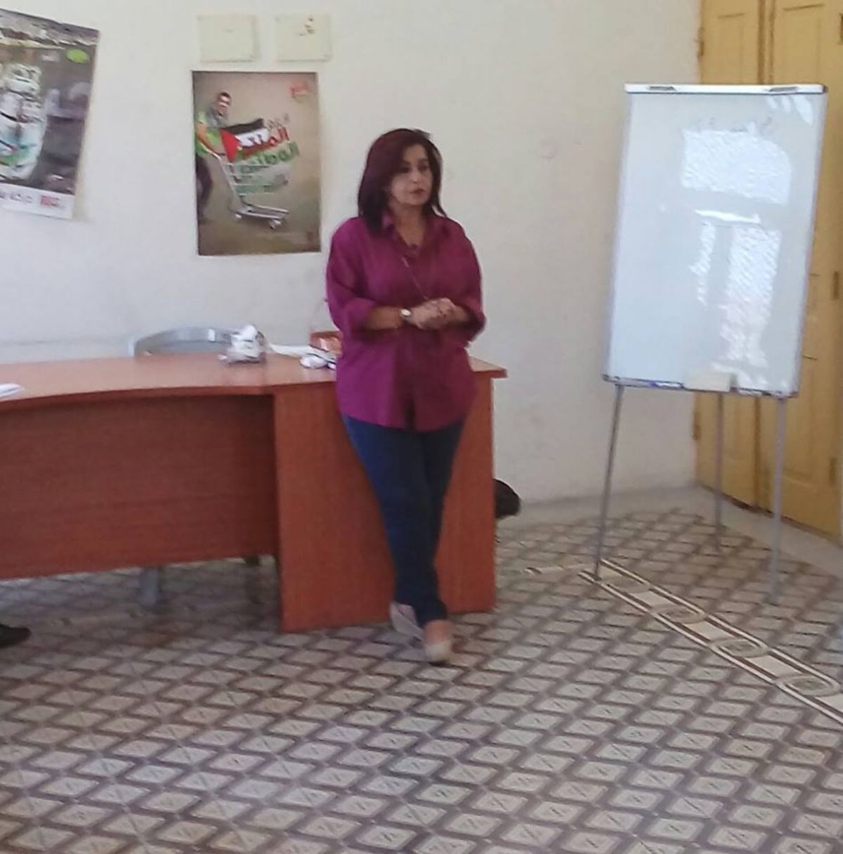 وقدمت الزميلة يسرى من اللجنة الاهلية ترحيب بالاتحاد والحملة النسائية والمشاركين وشاركت منسقة الحملة النسائية عصمت الشخشير بتوضيح حول اهمية المقاطعة ودور النساء بالمقاطعة.