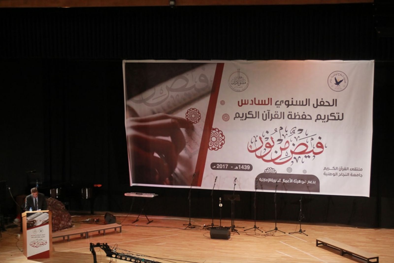 تأكيداً لدورها الديني الذي يشكل محوراً من أهم محاور رسالتها المجتمعية، نظّمت جامعة النجاح الوطنية ممثلةً بملتقى القرآن الكريم وعمادة شؤون الطلبة في الجامعة، وبدعم من هيئة الأعمال الخيرية الإماراتية، يوم الثلاثاء الموافق 10/10/2017، الحفل السنوي السادس والذي حمل عنوان (غيضٌ من فيض) لتخريج الفوز الثالث من حفظة كتابة الله، حيث أُقيم الحفل في مسرح سمو الأمير تركي بن عبد العزيز في الحرم الجامعي الجديد.