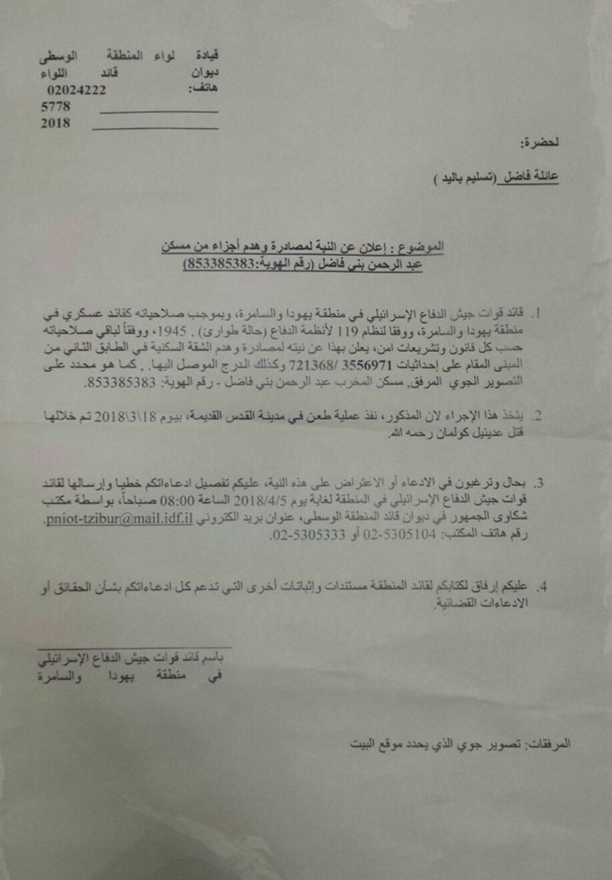 اخطرت سلطات الاحتلال فجر اليوم الاثنين عائلة الشهيد عبد الرحمن ماهر بني فضل من بلدة عقربا جنوب شرق نابلس بقرار مصادرة وهدم منزلها. وجاء في الاشعار الذي جرى تسليمه للعائلة ان قائد ما يسمى جيش الاحتلال في الضفة قرر مصادر وهدم الشقة في الطابق الثاني من منزل العائلة وكذلك الدرج المؤدي اليه. وجاء في الاخطار ان القرار جاء على خلفية طعن الشهيد مستوطنا في القدس الشهر الفائت واعطى الاخطار للعائلة المجال للاعتراض خلال مدة معينة.