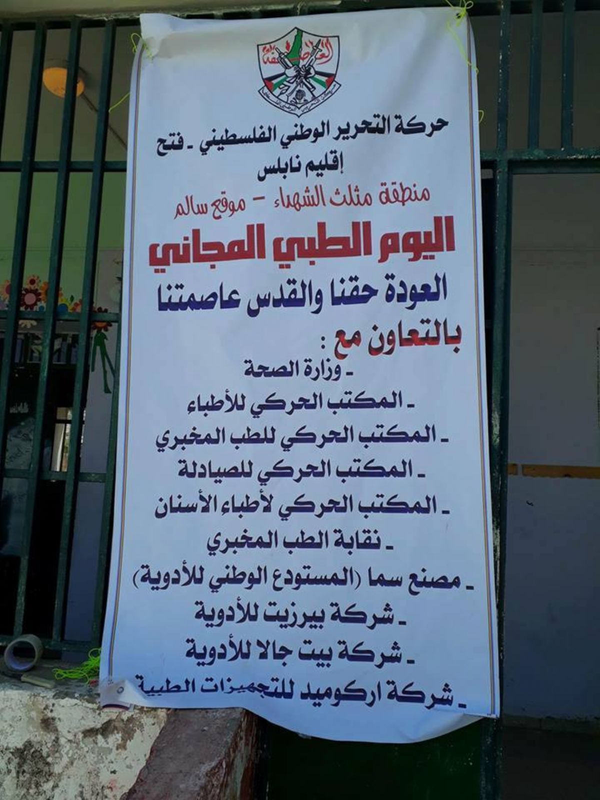 نظمت حركة التحرير الوطني الفلسطيني فتح/إقليم نابلس بالتعاون مع وزارة الصحة ونقابة الطب المخبري، ومصنع سما وشركة بير زيت وشركة بيت جالا للأدوية، وشركة اركوميد للتجهيزات الطبية، والمكاتب الحركية للأطباء وأطباء الأسنان والصيادلة والطب المخبري ، يوم الجمعة الموافق 11/5/2018 يوما طبيا مجانيا " العودة حقنا والقدس عاصمتنا" تزامنا مع الذكرى السبعين لنكبة الشعب الفلسطيني ، وذلك في منطقة مثلث الشهداء/ موقع سالم في مدرسة بنات سالم الثانوية.