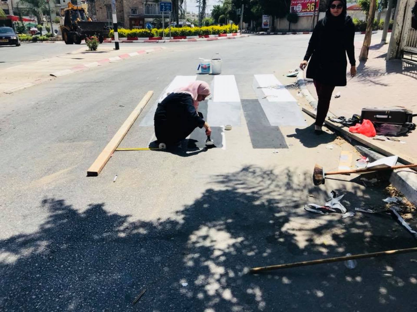 بوجوه باسمة وروح الجماعة الشابة خط طلبة من جامعة فلسطين التقنية خضوري بريشهم المغمورة باللونين الأبيض والأسود وموهبتهم الفنية العطشة للإبداع والتميز خطوط مشاة ثلاثية الأبعاد” 3D “ أمام مدرسة عبد المجيد تايه الأساسية في محافظة طولكرم موصلين رسالتهم بأسلوب فني خطف أنظار المارة.