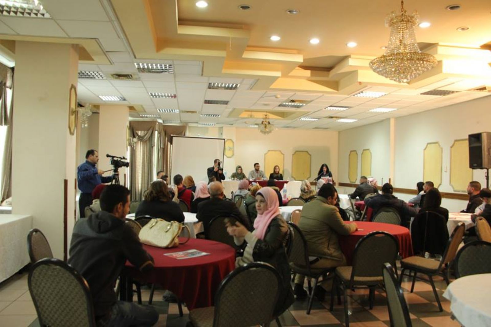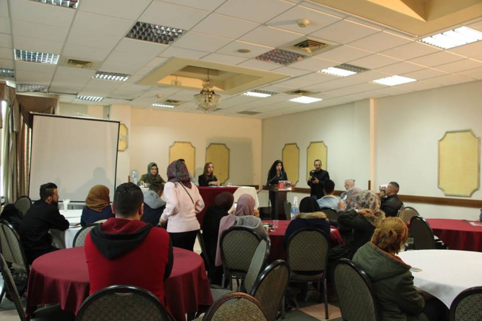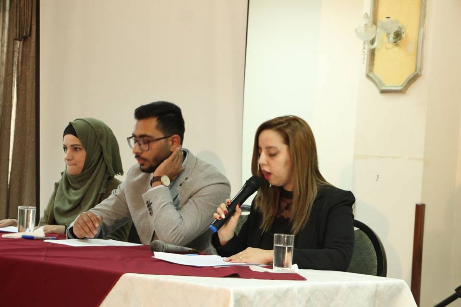 وتحدث مؤازرين مع المركز الفلسطيني لقضايا السلام والديمقراطية وهم اعضاء في الملتقى السياسي النسوي هبة سميرات واسلام نصر وعنبرة شلالدة عن الديمقراطية وارتباطها بالميثاق السياسي النسوي .