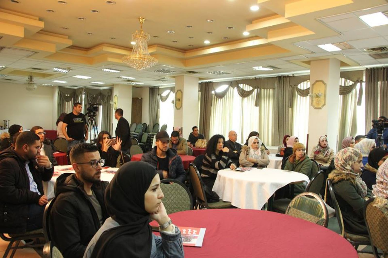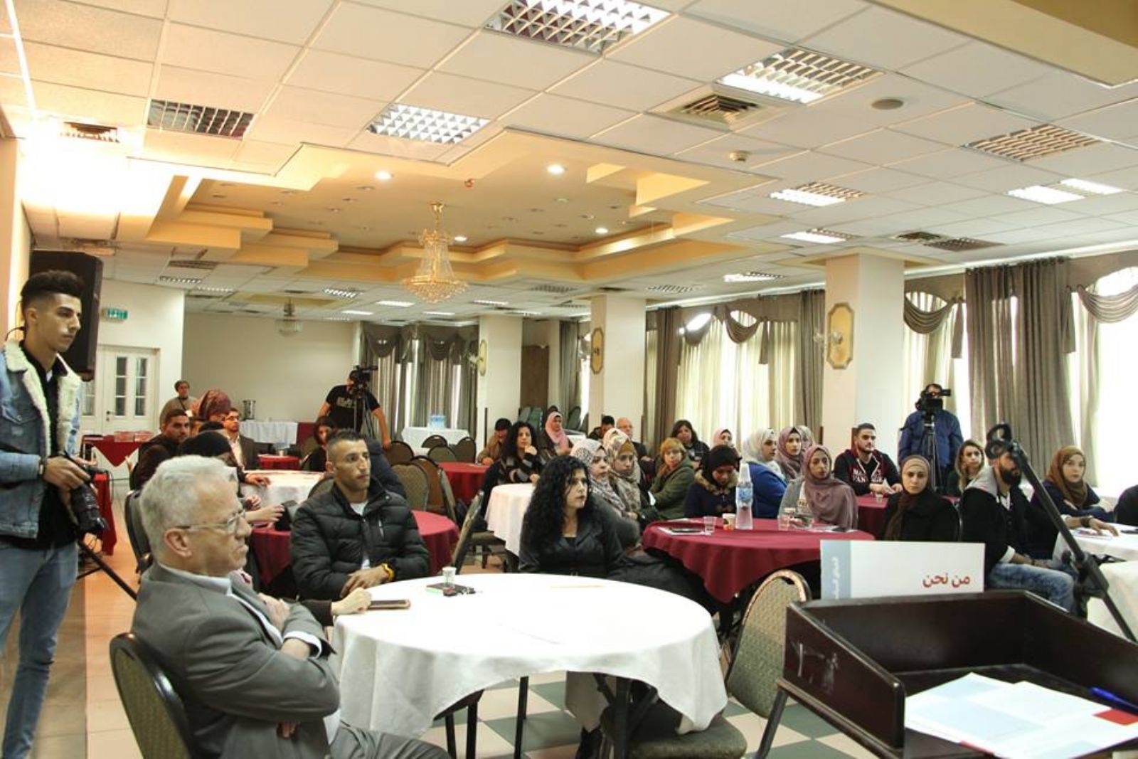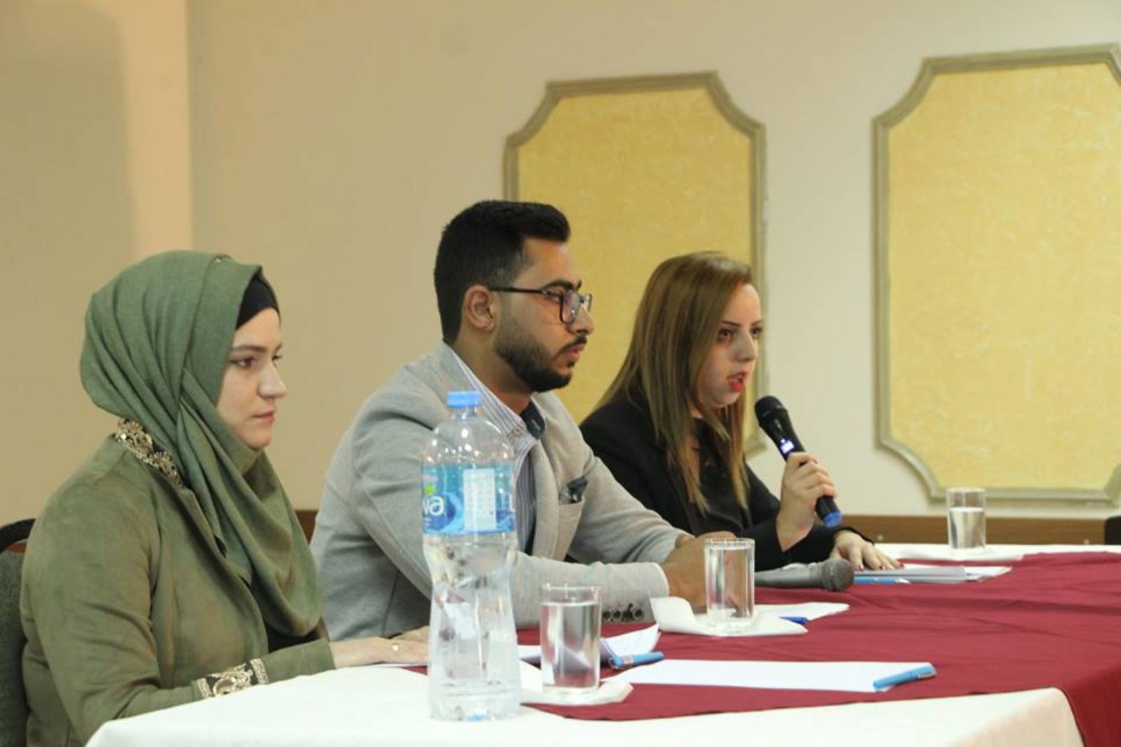 وتحدث مؤازرين مع المركز الفلسطيني لقضايا السلام والديمقراطية وهم اعضاء في الملتقى السياسي النسوي هبة سميرات واسلام نصر وعنبرة شلالدة عن الديمقراطية وارتباطها بالميثاق السياسي النسوي .