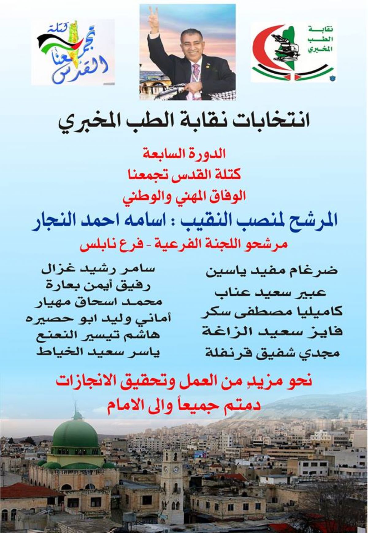 نابلس :- أعلنت لجنة الأشراف على انتخابات نقابة الطب المخبري في محافظة نابلس عن فوز كتلة القدس تجمعنا – قائمة الوفاق المهني والوطني – بالتزكية لعضوية اللجنة الفرعية للنقابه بنابلس للدورة السابعه والتي يمتد عملها ثلاث سنوات كما اعلن رسميا عن فوز اسامه النجار نقيبا للطب المخبري في فلسطين للدورة السابعة.