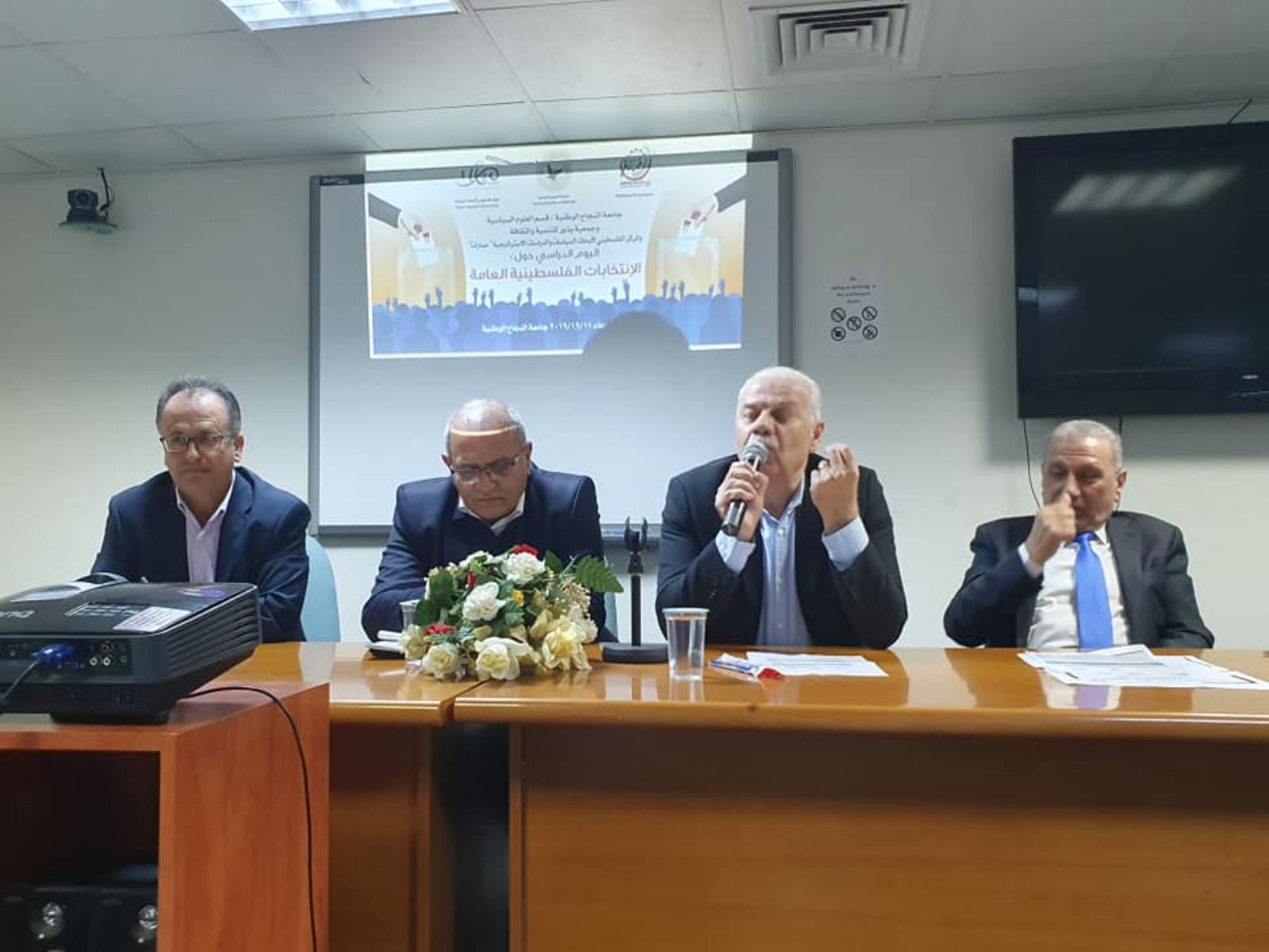 نابلس: نظّم كل من قسم العلوم السياسية في جامعة النجاح، وجمعية بذور، ومركز مسارات يومًا دراسيًا حول الانتخابات الفلسطينية العامة، عُقِد في قاعة المؤتمرات بمكتبة الجامعة، بحضور أكثر من 130 شخصًا، من بينهم أعضاء في الهيئة التدريسية وطلبة، إضافة إلى عدد من ممثلي الفصائل ومؤسسات المجتمع المدني.