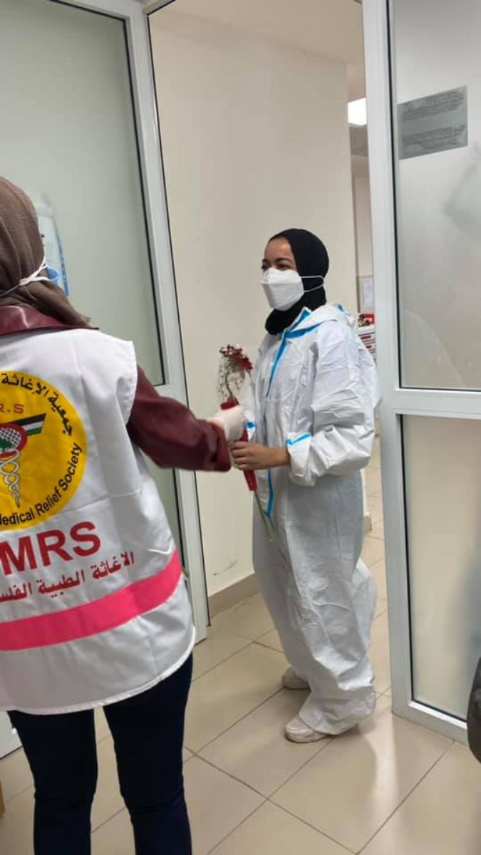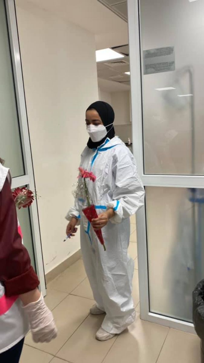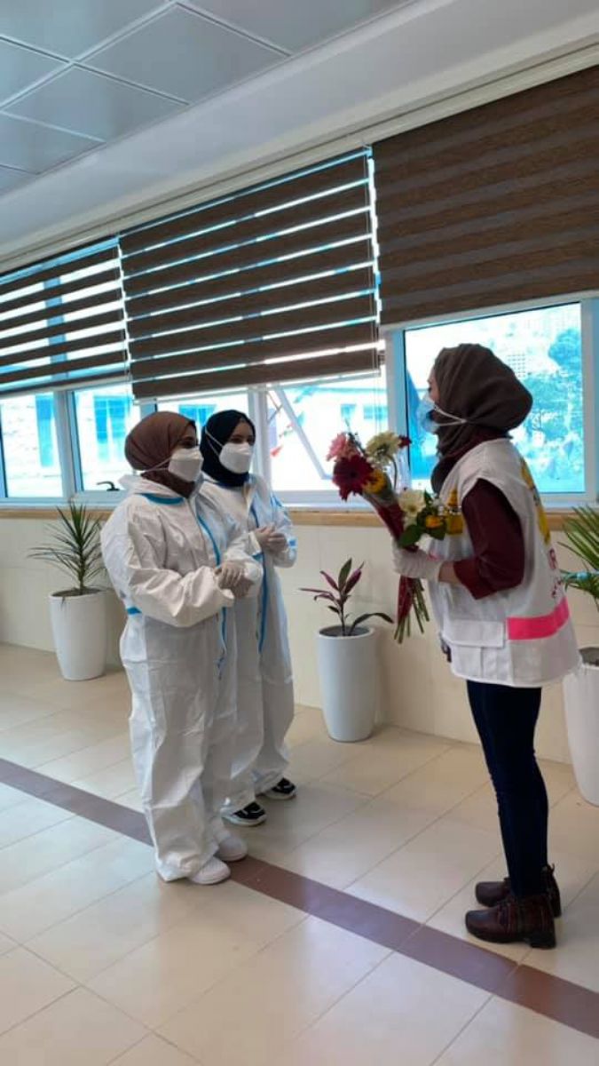 وتم خلال تلك الفعالية توزيع ورود على جميع العاملات والامهات في مركز كوفيد 19في الهلال الاحمر بمناسبة عيد الام من اجل التضامن معهن ومباركة جهودهن الكبيرة في خدمة المرضى وتقديرا للمخاطر والضغوط الت تواجههن.