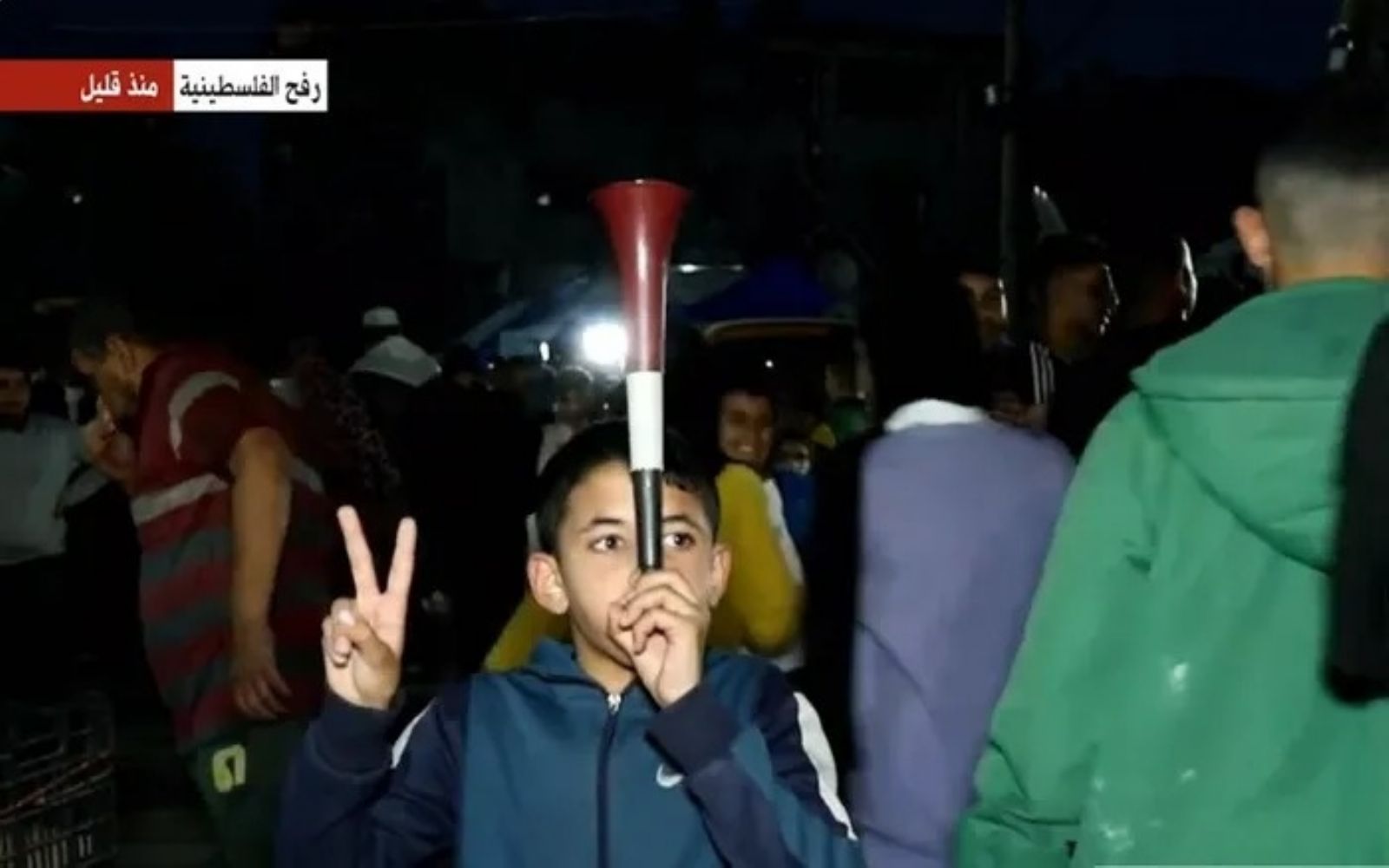 شهدت مدينة رفح، مساء اليوم الاثنين، احتفالات تزامنا مع إعلان حركة حماس الموافقة على وقف إطلاق النار، حيث خرج الفلسطينيون لشوارع المدينة مهللين ورافعين الأعلام الفلسطينية.