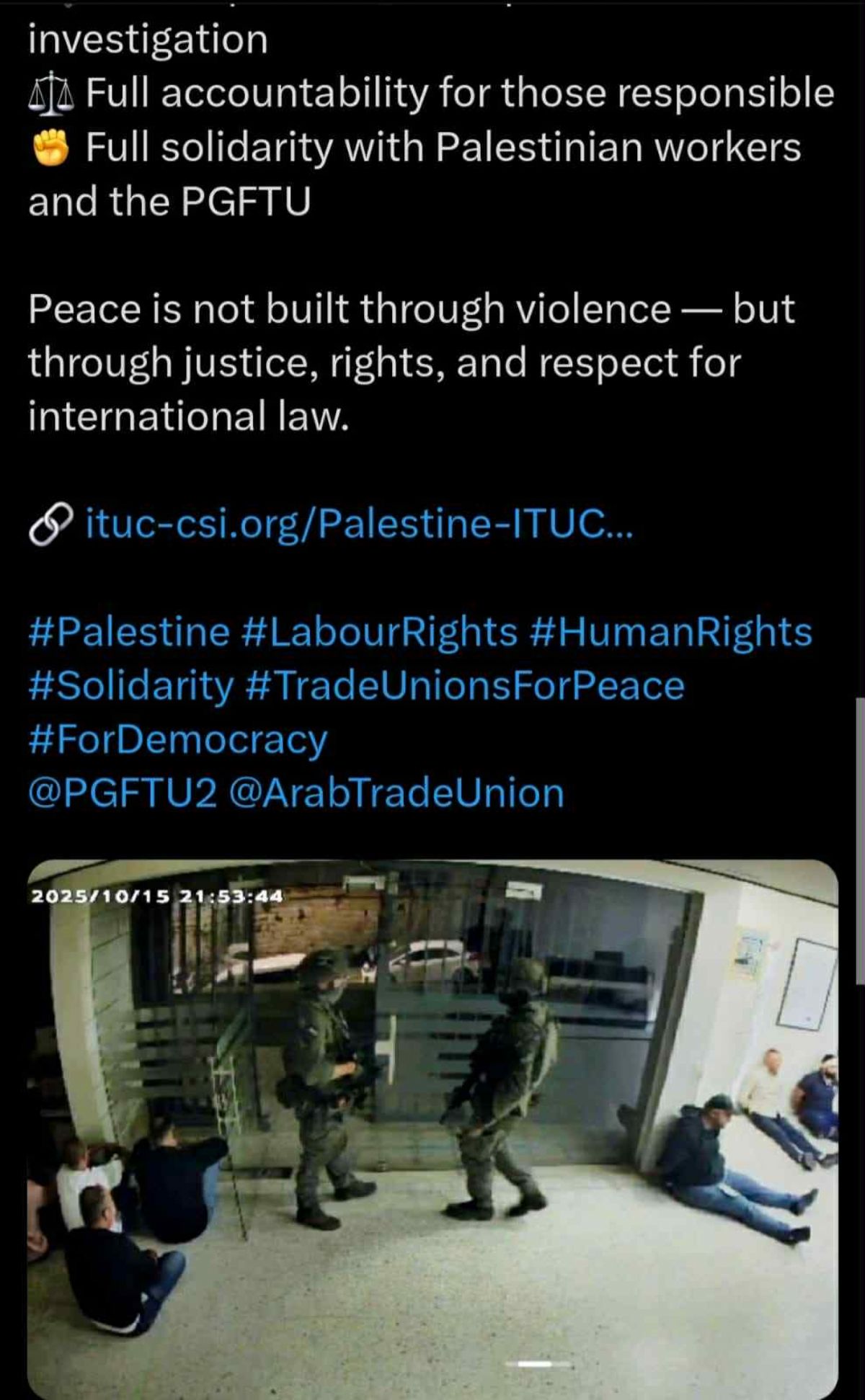 وطالب بإجراء تحقيق فوري ومستقل وشفاف في الحادث، ومحاسبة جميع المسؤولين عنه، مؤكدًا تضامن الاتحاد الدولي الكامل مع الاتحاد العام لنقابات عمال فلسطين وجميع العمال الفلسطينيين المستهدفين بهذا العدوان.