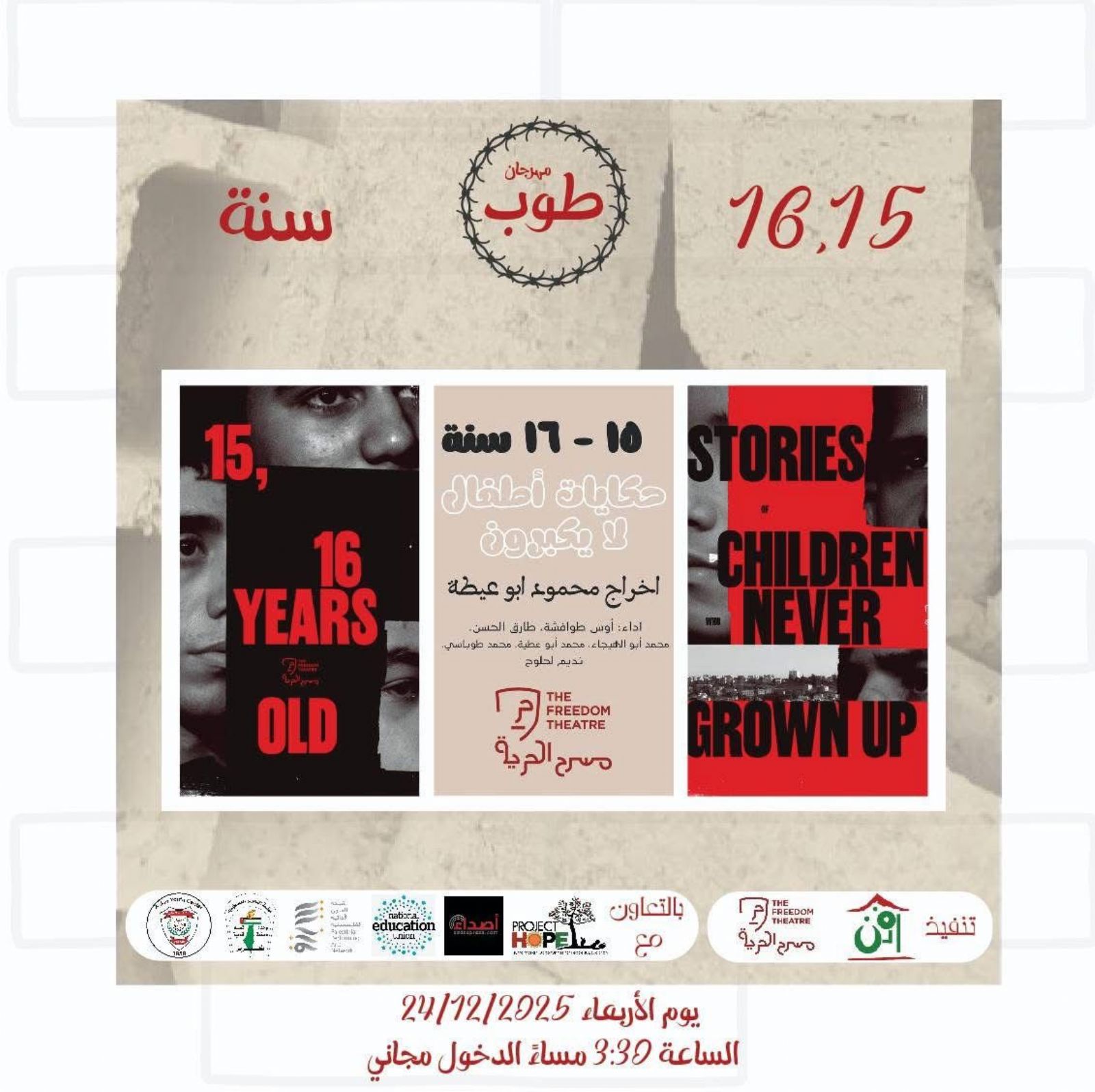 عمل مبني على شهادات حيّة من مخيم جنين، من اخراج محمود ابو عيطة، يتناول الطفولة الفلسطينية تحت العنف اليومي، حيث يتحول الخوف إلى مادة فنية، والشهادة إلى فعل جماعي. يعتمد العرض على الحركة والارتجال، ويقدّم صورة قاسية وصادقة عن جيل يعيش على حافة الحياة والموت، دون تزيين أو مبالغة، ويقوم باداء المسرحية يافعين من مخيم جنين؛ أوس طوافشة، طارق الحسن، محمد ابو عطية، محمد أبو الهيجاء، محمد طوباسي، ونديم لحلوح.