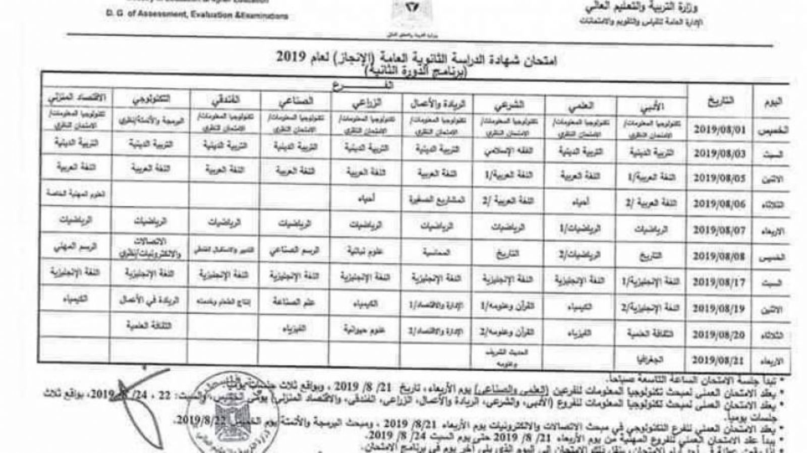 جدول امتحانات الإعادة لطلبة الثانوية العامة في فلسطين