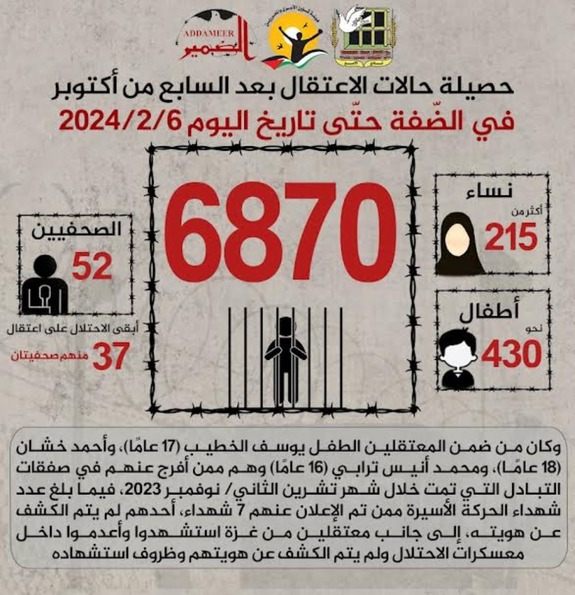 الاحتلال اعتقل من الضّفة خلال كانون الثاني/ يناير 2024، (1236) فلسطينيًا حصيلة الاعتقالات بعد السابع من أكتوبر في الضّفة ارتفعت إلى (6870)