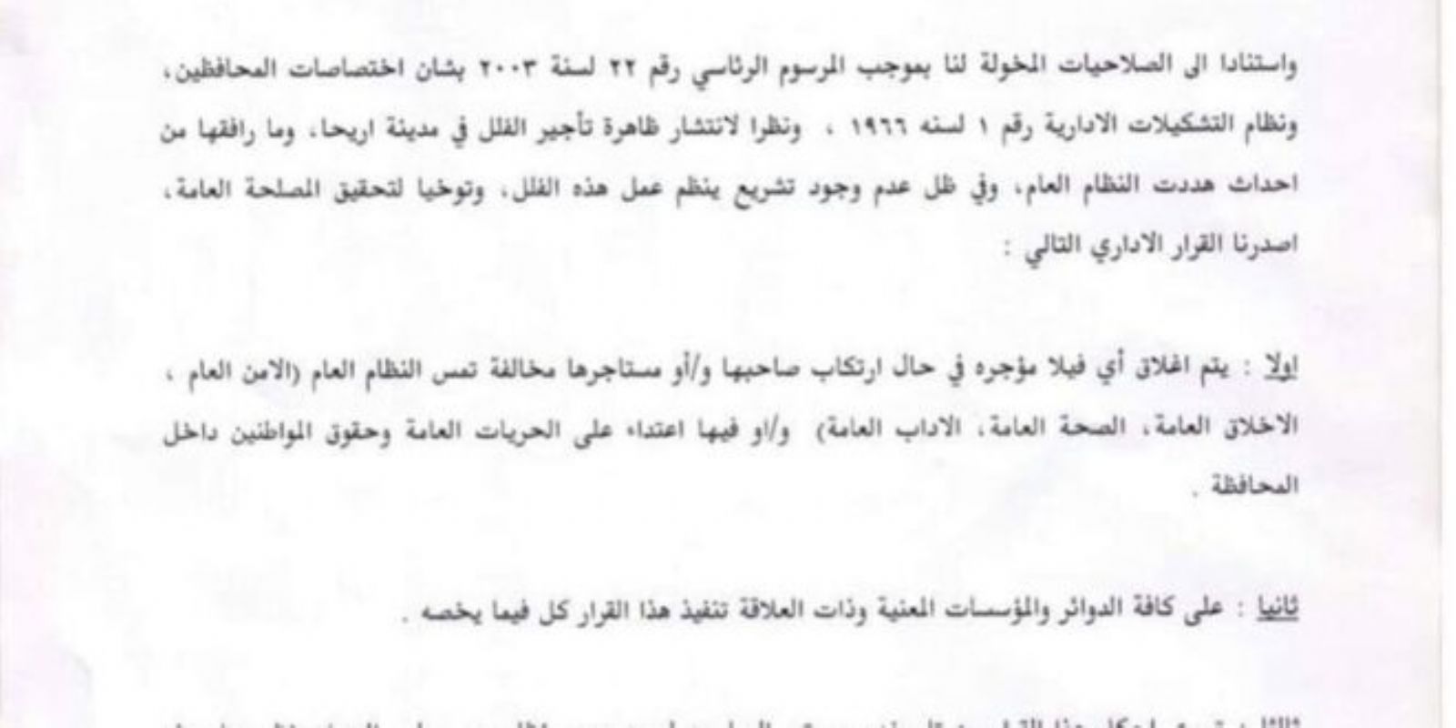 محافظ أريحا يصدر قرارا بإغلاق أي فيلا مؤجرة في حال ارتكاب صاحبها او مستأجرها مخالفة تمس النظام العام